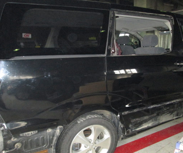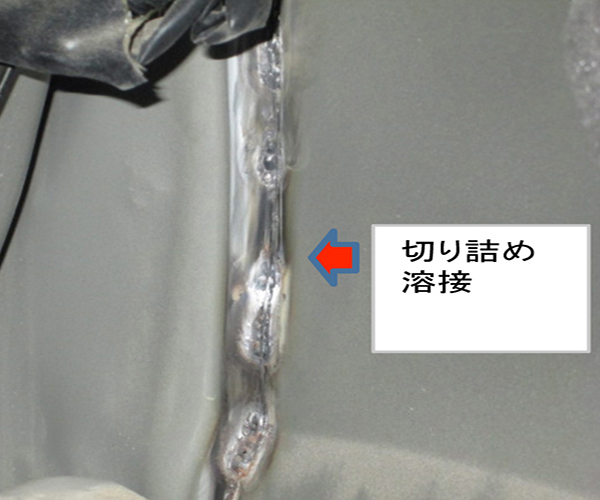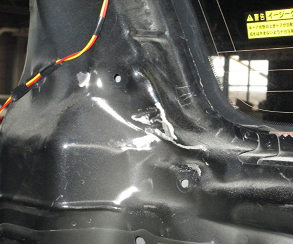 入庫した車両の外板パネルの隙間が均一になっていなかった。過去の後部損傷時に粗出し作業(変形したリヤフェンダー部を戻すための引き作業)が不完全だったものと思われる。スライドドア開口部が狭くなっており、リヤフェンダーの前部を切り詰めて溶接してあった。悪質な修理事例であり、本来実施すべき作業を怠っている。